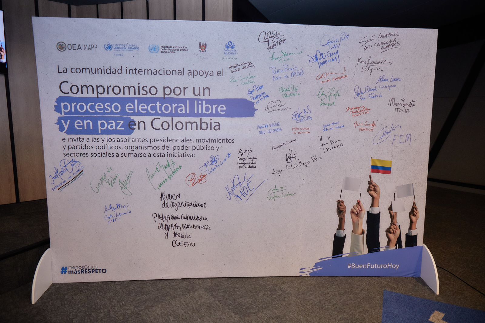 En un gesto simbólico que deja huella, los participantes firmaron el Compromiso como acto de respaldo y esperanza, reiterando un mensaje claro para el país: la comunidad internacional acompaña y respalda a Colombia en su apuesta por la vida, la dignidad y el derecho a elegir y ser elegido en paz.