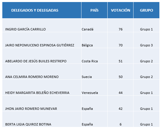 La Defensoría del Pueblo, a través de su Delegada para Orientación y Asesoría a las Víctimas del Conflicto Armado, realizó una transmisión en vivo en la que se dieron a conocer los resultados de la votación de Víctimas en el Exterior. La Defensoría del Pueblo, en su rol de Secretaría Técnica de la mesa, informó que, de 578 opciones de voto válidas, se registraron un total de 458 votos que eligieron a los delegados y delegadas por las Organizaciones de Víctimas en el Exterior, de la siguiente manera: