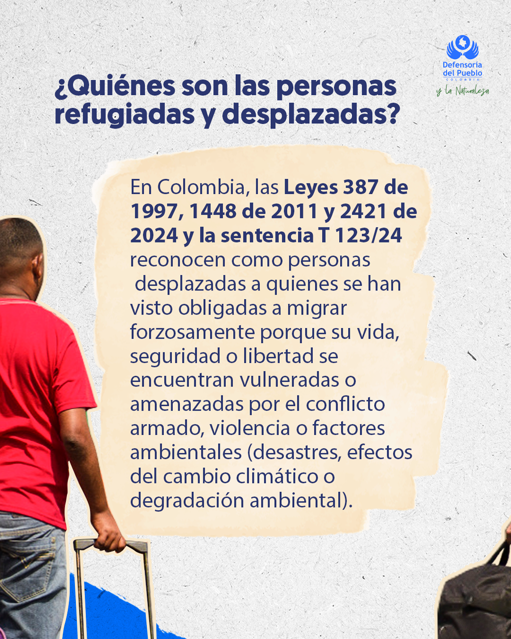 En el contexto colombiano, las leyes 387 de 1997, 1448 de 2011, 2421 de 2024 y la Sentencia T-123 de 2024 reconocen como personas desplazadas a quienes han migrado forzosamente dentro del territorio nacional debido a amenazas contra su vida, seguridad o libertad, derivadas del conflicto armado, la violencia generalizada o factores ambientales.