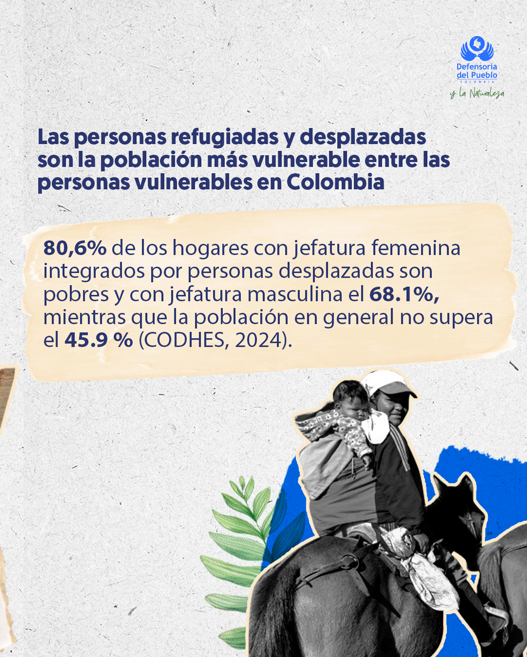 La IV Encuesta Nacional de Verificación de Goce Efectivo de Derechos de la Población Desplazada por el Conflicto Armado en Colombia, realizada por CODHES (2024), evidenció que el 76.1% de los hogares de personas desplazadas se encuentran en situación de pobreza, contrastando con el 45.9% del promedio nacional. Esta cifra se eleva al 80.6% en hogares con jefatura femenina, y al 68.1% en hogares con jefatura masculina.