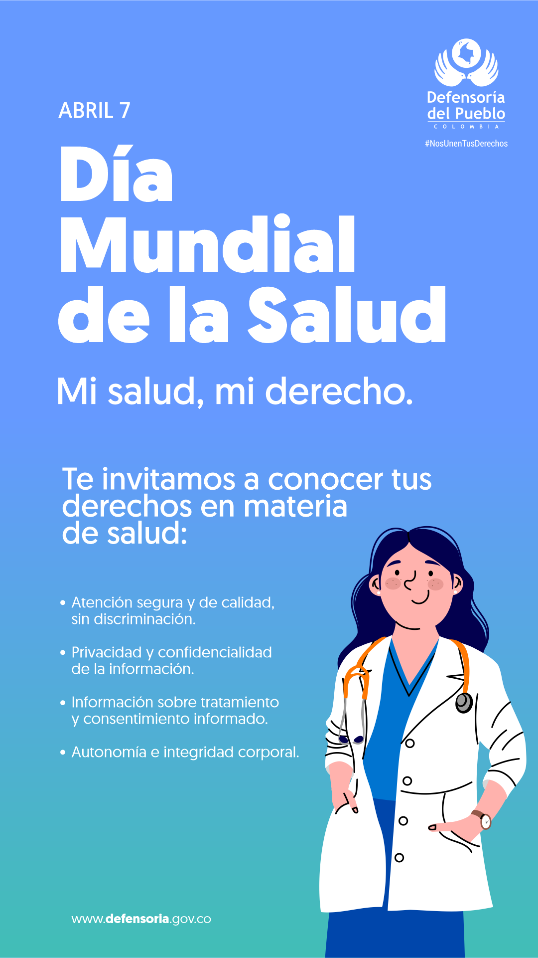 En el Día Mundial de la Salud, la Defensoría del Pueblo reitera su compromiso con la defensa del derecho a la salud de todos los colombianos. Para ello impulsamos proyectos y actividades para concientizar sobre los derechos a la salud y la seguridad social, trabajando de manera articulada con el Gobierno Nacional, los actores del Sistema General de Seguridad Social en Salud, gremios y otras organizaciones relevantes para garantizar el acceso a la salud de todos los colombianos.