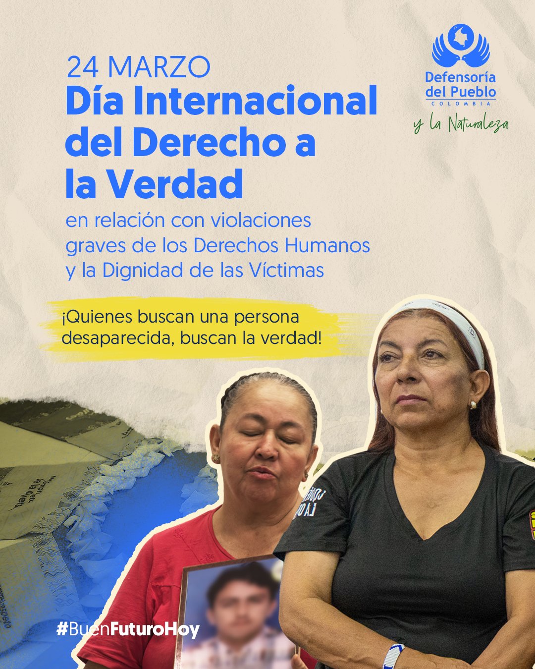 La Defensoría del Pueblo promueve iniciativas en torno al significado de la verdad y resalta la importancia de este derecho para las víctimas del conflicto y en general, para toda la sociedad colombiana como una garantía de no repetición. Quienes buscan la verdad de lo ocurrido, son agentes de transformación social que contribuyen a la reconciliación y la paz, por eso en esta conmemoración la Defensoría del Pueblo destaca la labor de las mujeres buscadoras.
