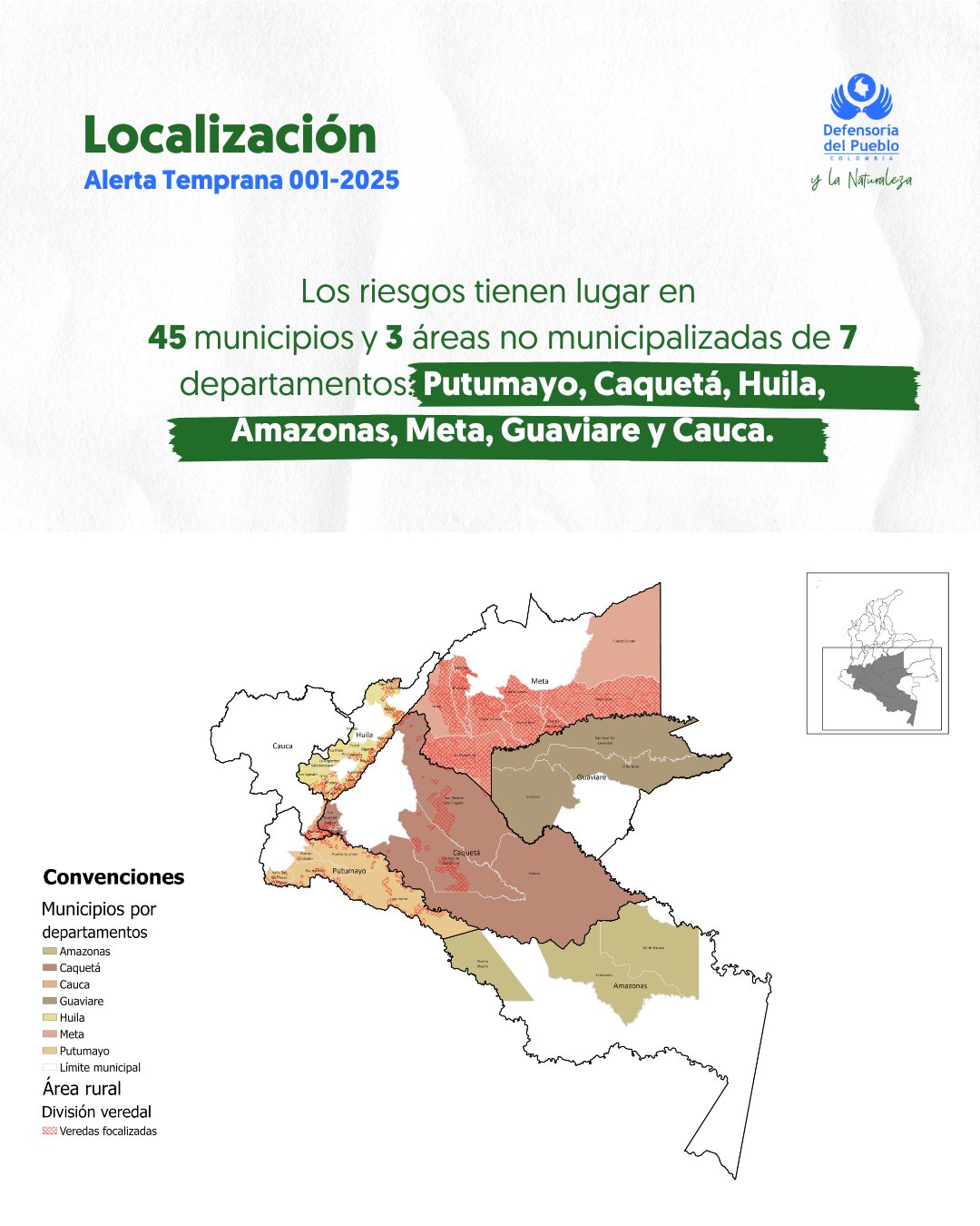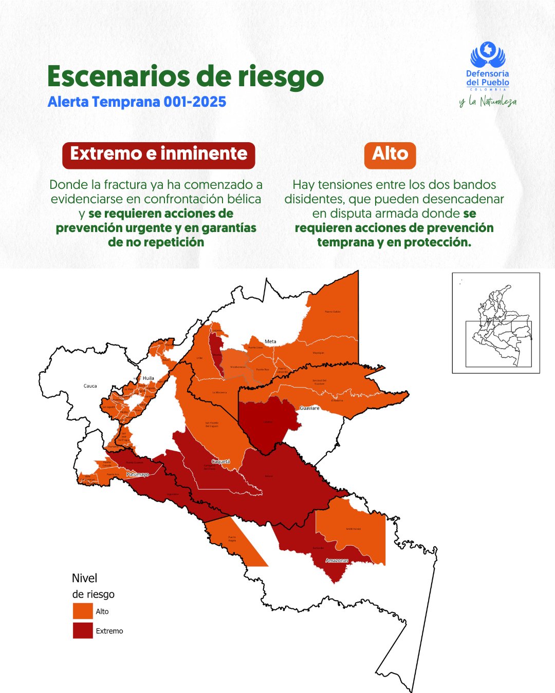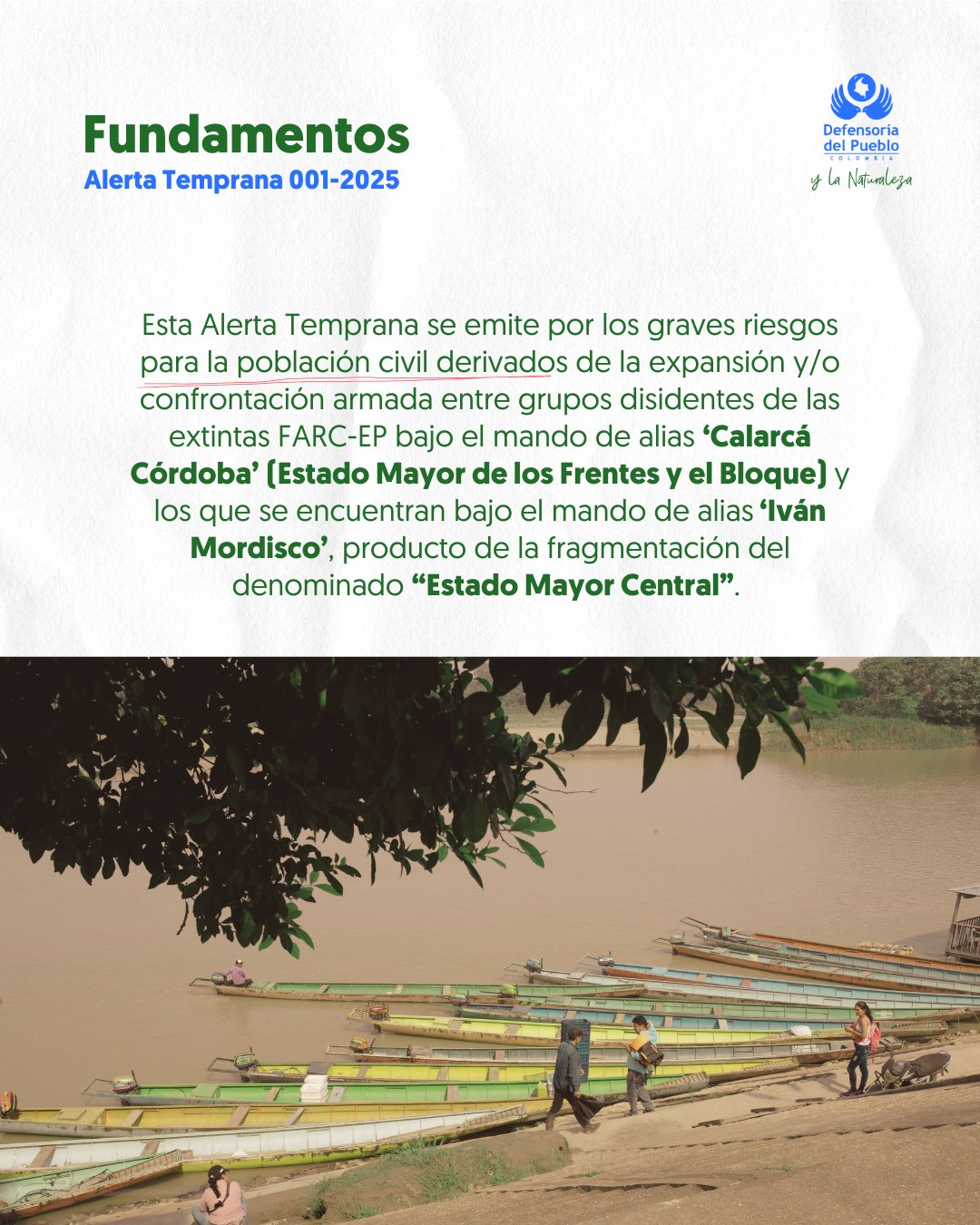 La Defensoría del Pueblo emite Alerta Temprana sobre riesgos por la confrontación armada entre grupos disidentes de Mordisco y Calarcá