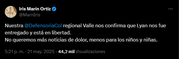 “Nuestra @DefensoriaCol regional Valle nos confirma que Lyan nos fue entregado y está en libertad. No queremos más noticias de dolor, menos para los niños y niñas”, expresó la Defensora del Pueblo, Iris Marín Ortiz, en su cuenta de X, luego de que una comisión humanitaria, integrada por la Iglesia Católica, la ONU y la Defensoría del Pueblo, recibiera Lyan José Hortúa, el niño de 11 años de que fue raptado en Jamundí, Valle del Cauca, el pasado 3 de mayo.