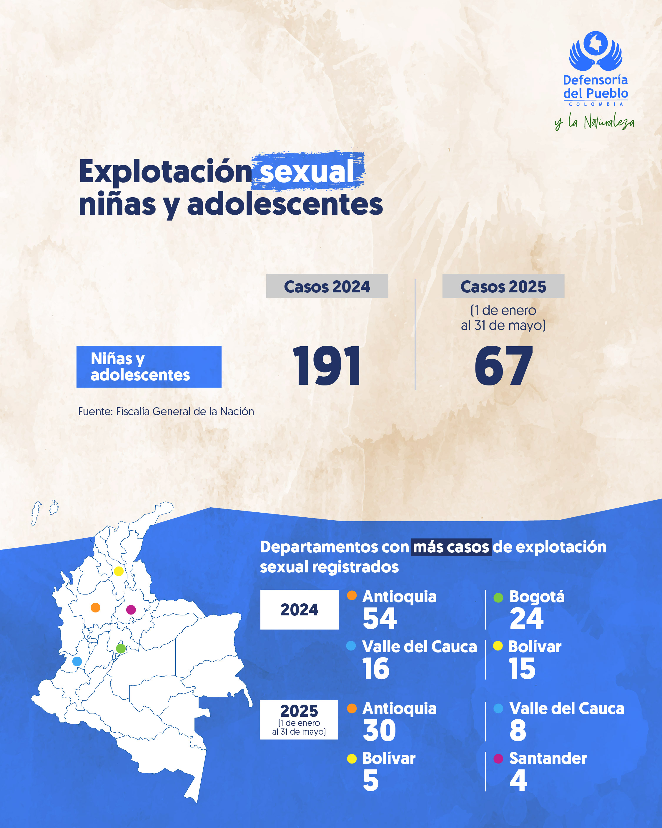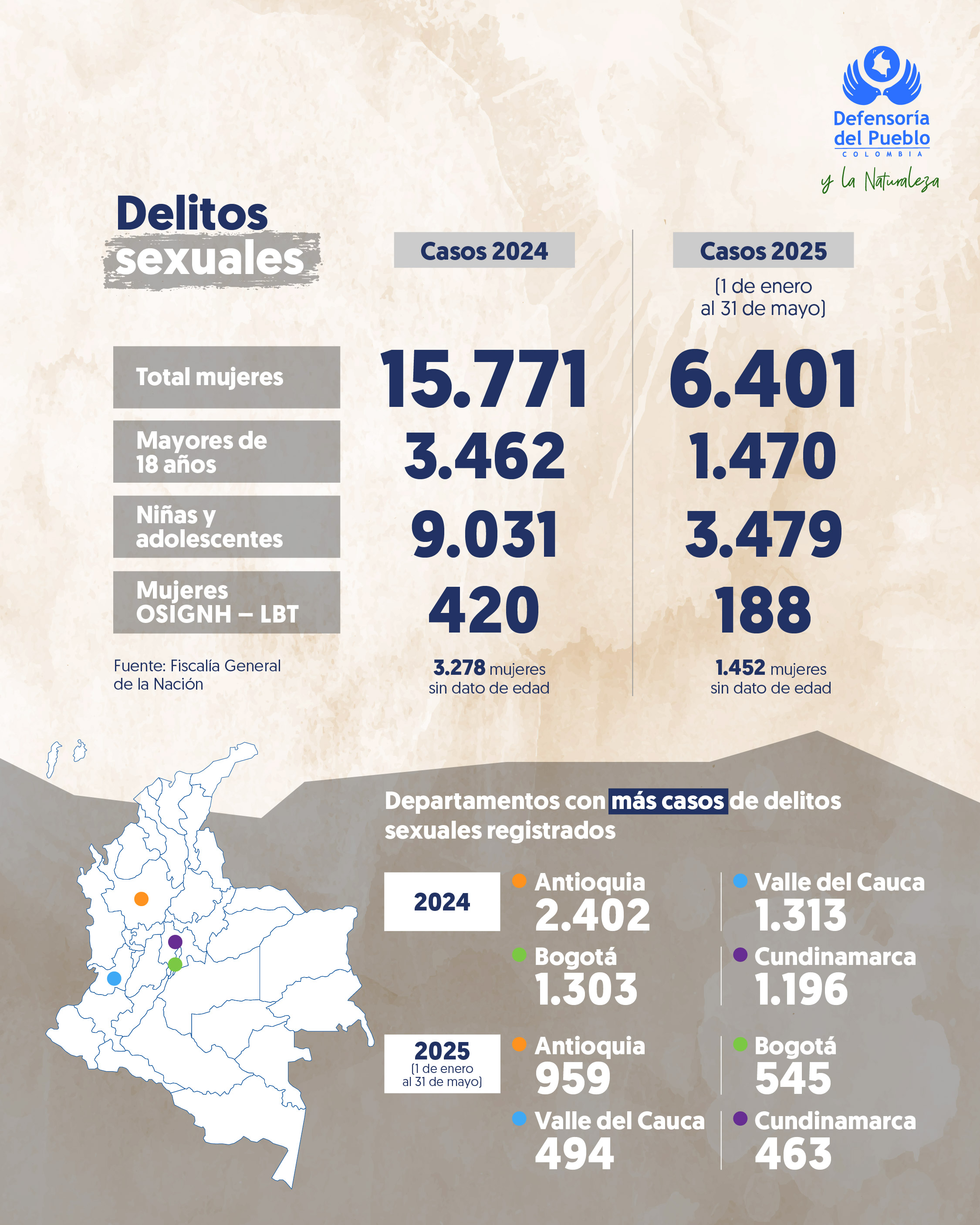 La Defensoría del Pueblo presenta un consolidado de las violencias de género registradas en Colombia durante el periodo comprendido entre el 1 de enero y el 31 de mayo de 2025. Este informe detalla la incidencia de feminicidios, violencia intrafamiliar, delitos sexuales, trata de personas y explotación sexual de niñas, niños y adolescentes, desglosando los casos por tipo de violencia y las regiones con mayor número de reportes.