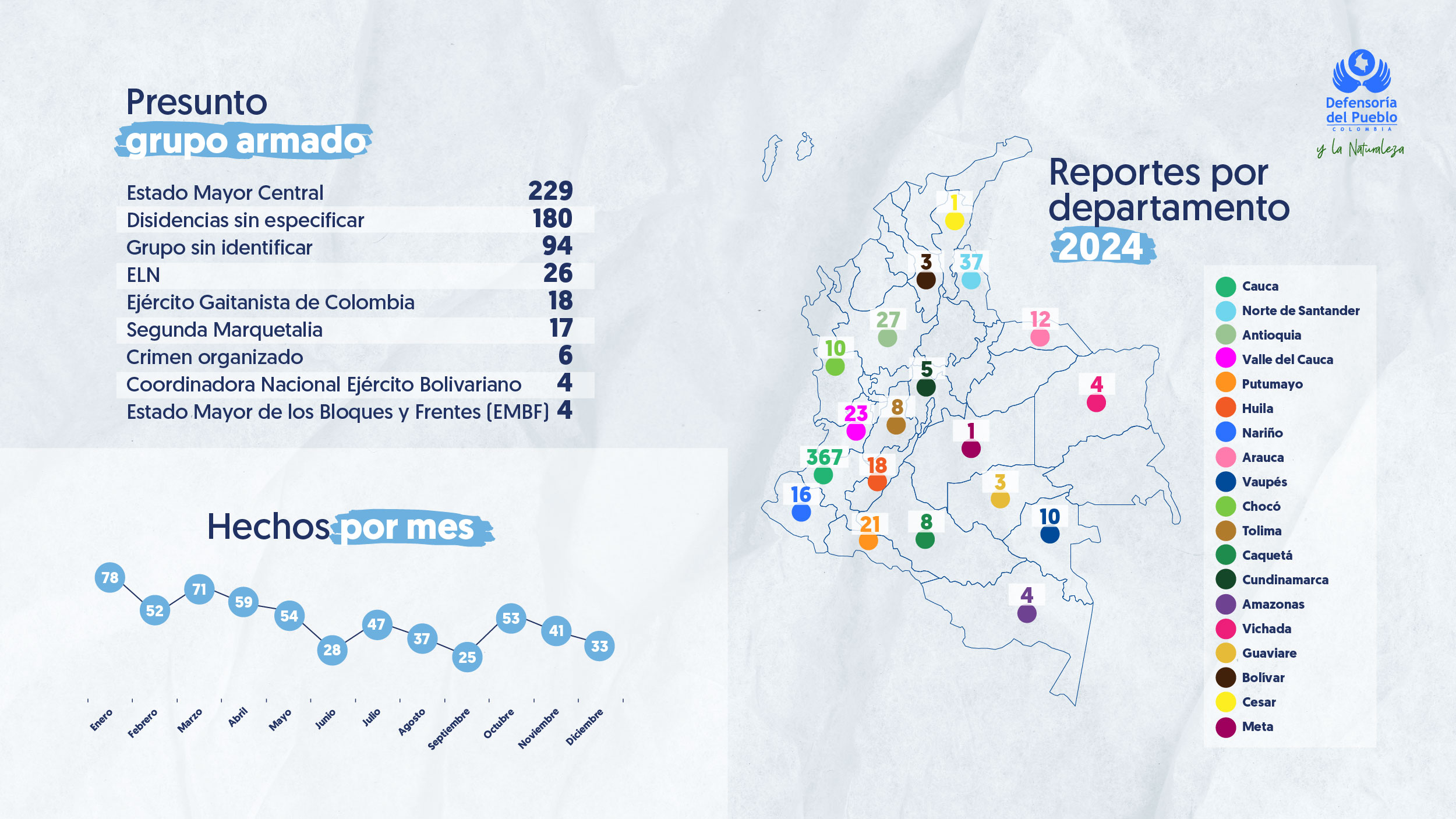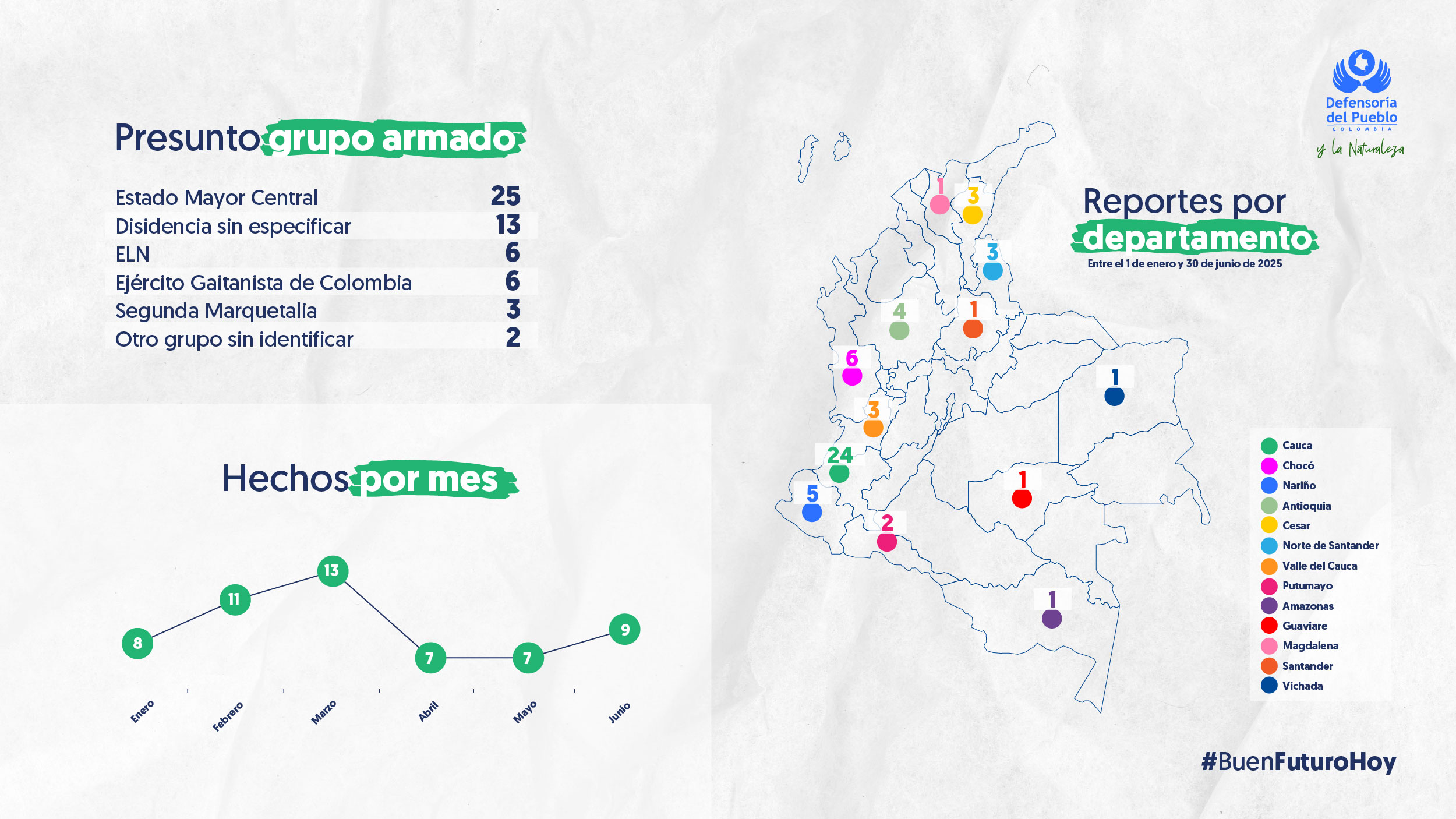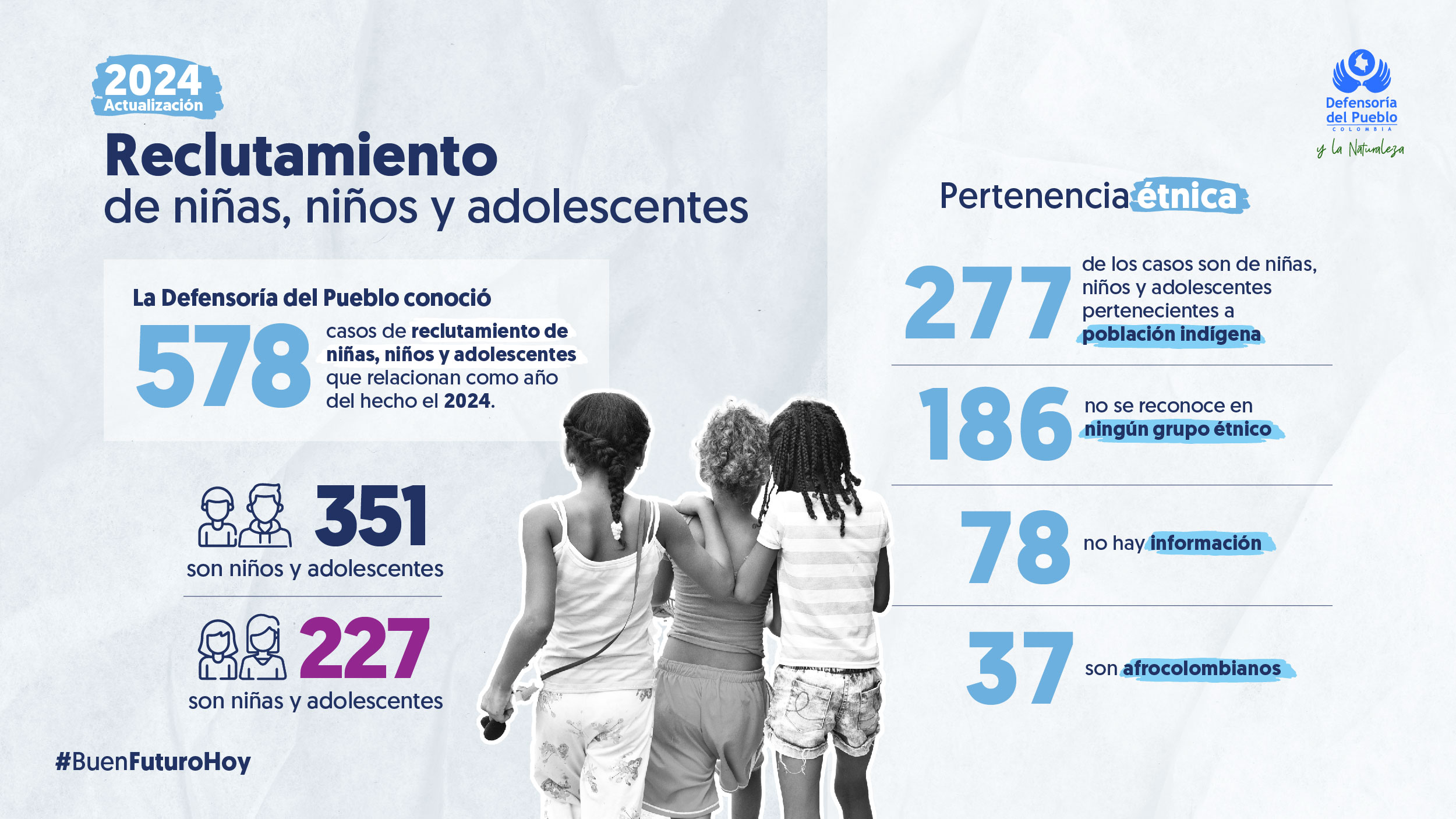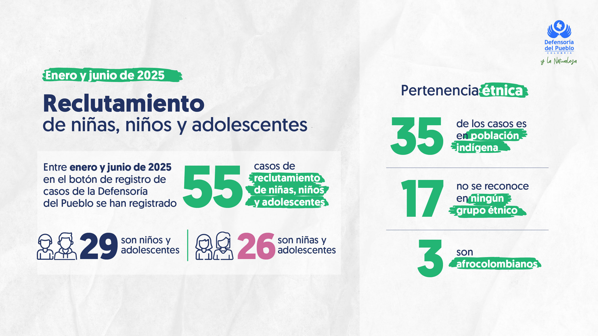 Entre enero y junio de 2025, la Defensoría del Pueblo conoció 55 casos de reclutamiento, de los cuales 29 afectaron a niños y adolescentes, y 26 a niñas y adolescentes. La situación es particularmente preocupante para la población indígena, que suma 35 de los casos. Adicionalmente, Cauca es el departamento con mayor número de reportes. En 2024, se registraron 578 casos que afectaron particularmente a niñas, niños y adolescentes.