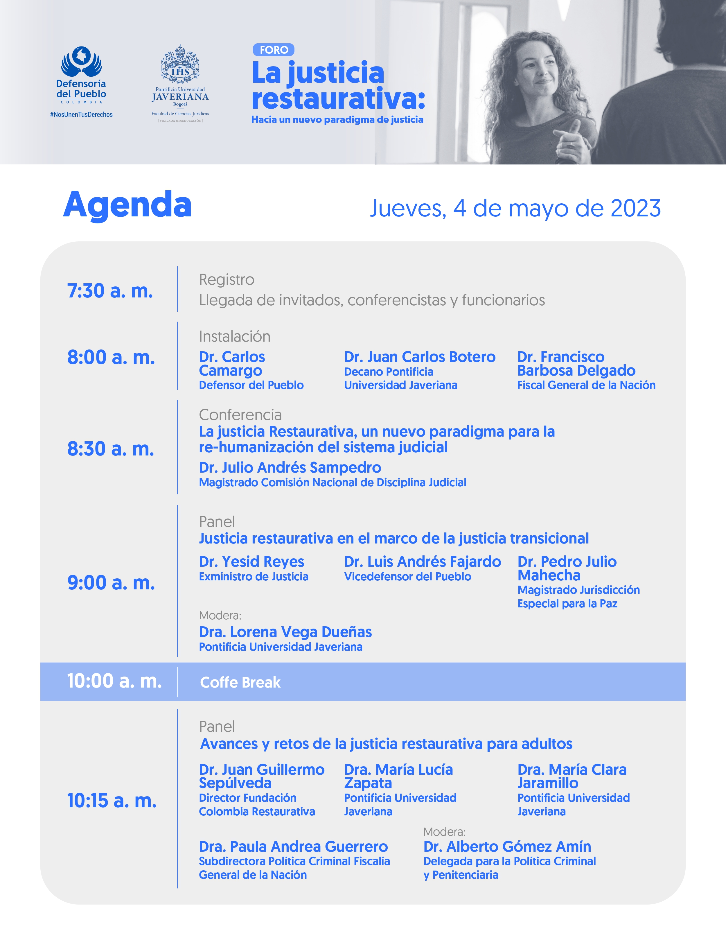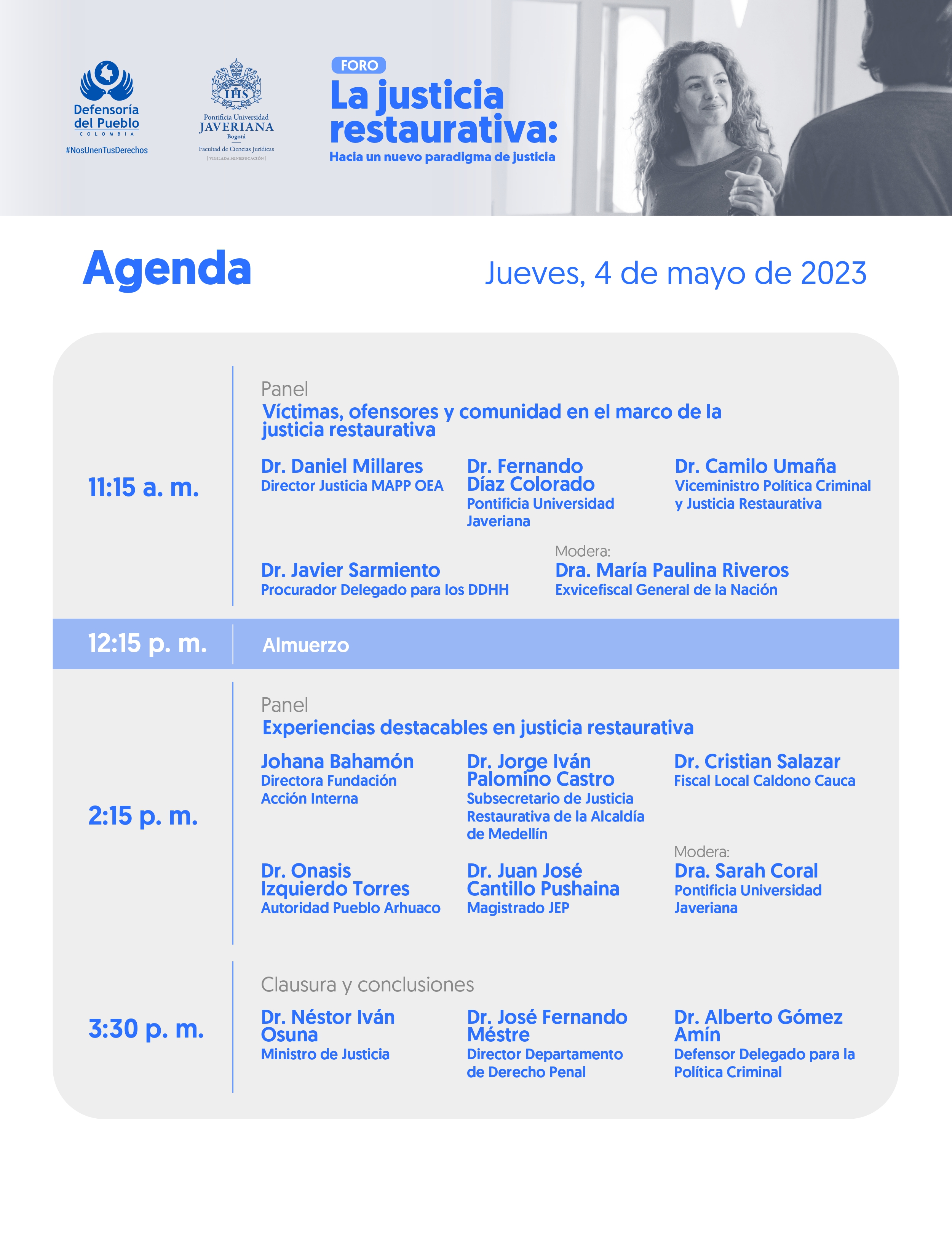 Este jueves 4 de mayo el Defensor del Pueblo, Carlos Camargo Assis, instala el foro La justicia restaurativa: hacia un nuevo paradigma de justicia, organizado por la Defensoría del Pueblo y la Universidad Javeriana. Entre los invitados están el Fiscal General, Francisco Barbosa, y el Ministro de Justicia, Néstor Osuna, además de magistrados y académicos.