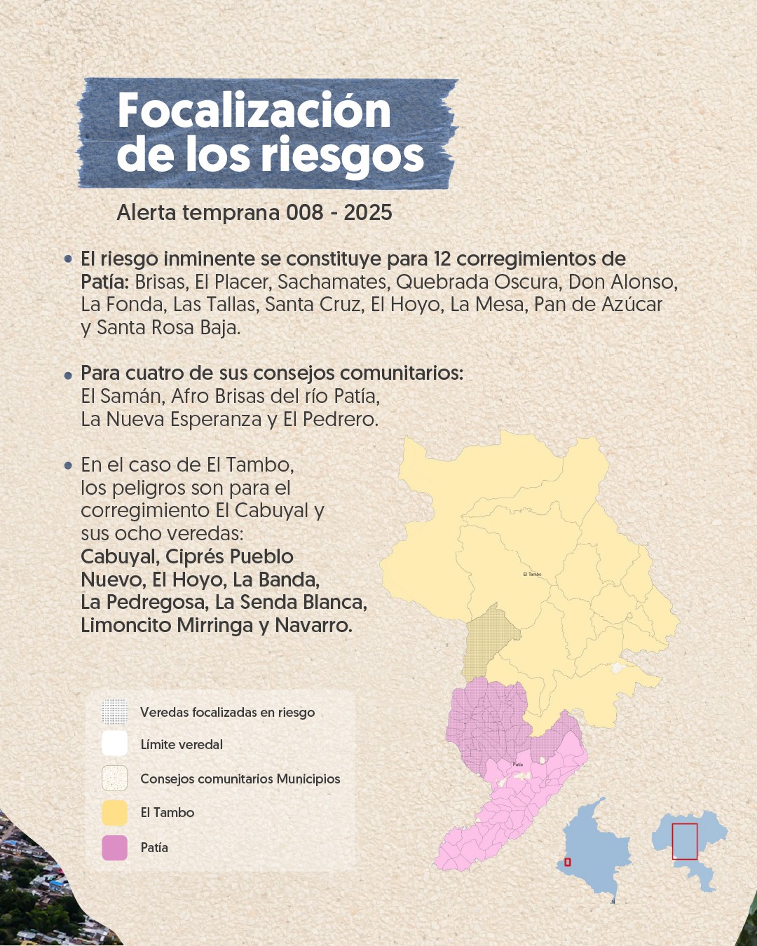 • El documento de advertencia y prevención focaliza los riesgos para 12 corregimientos de Patía y cuatro de sus consejos comunitarios, y para un corregimiento de El Tambo, que incluye sus ocho veredas.